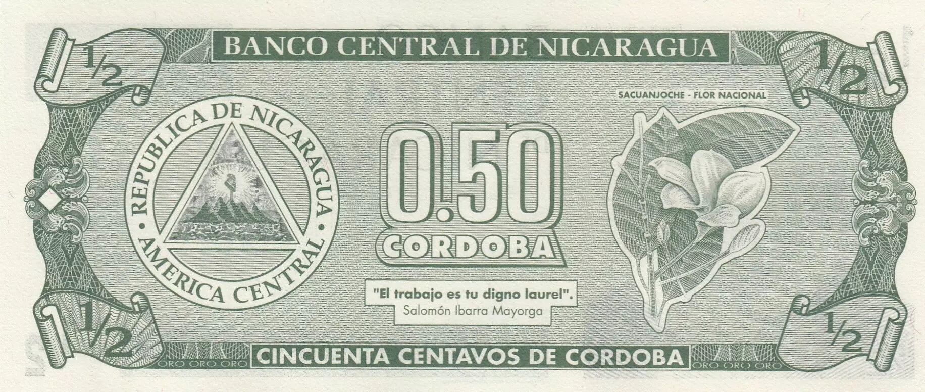 Le verso du billet met en avant les armoiries du Nicaragua, positionnées à gauche. La valeur "1/2" est répétée aux quatre coins du billet. Au centre, on peut lire "0.50 cordoba". À droite, une représentation de la fleur nationale, le sacuanjoche, complète le design. L'orientation du billet est horizontale.