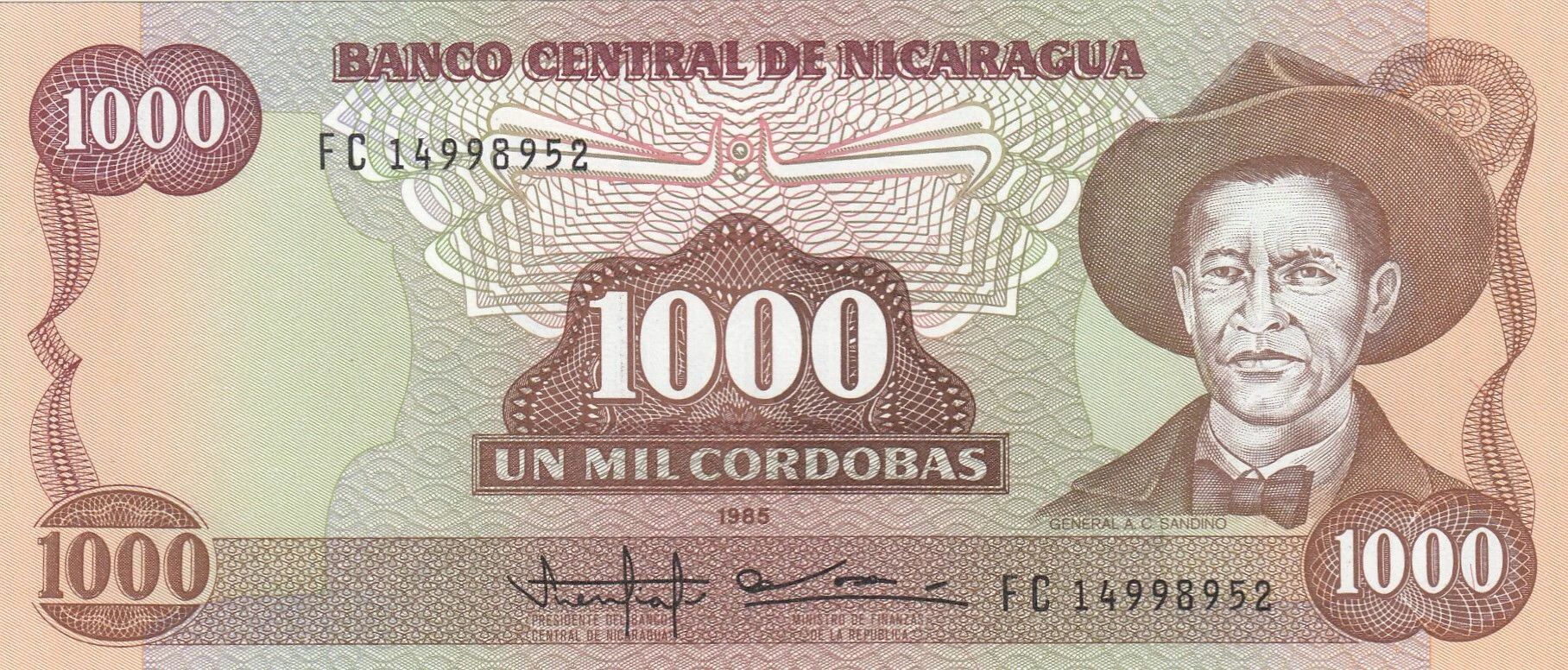 This banknote originates from Nicaragua and was issued in 1985. It represents a face value of 1000 cordobas. It belongs to the FC series.
