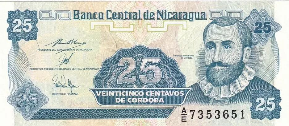 Le billet de 25 centavos du Nicaragua, émis en 1991. Il arbore les dimensions de 120 millimètres de longueur et 53 millimètres de largeur.