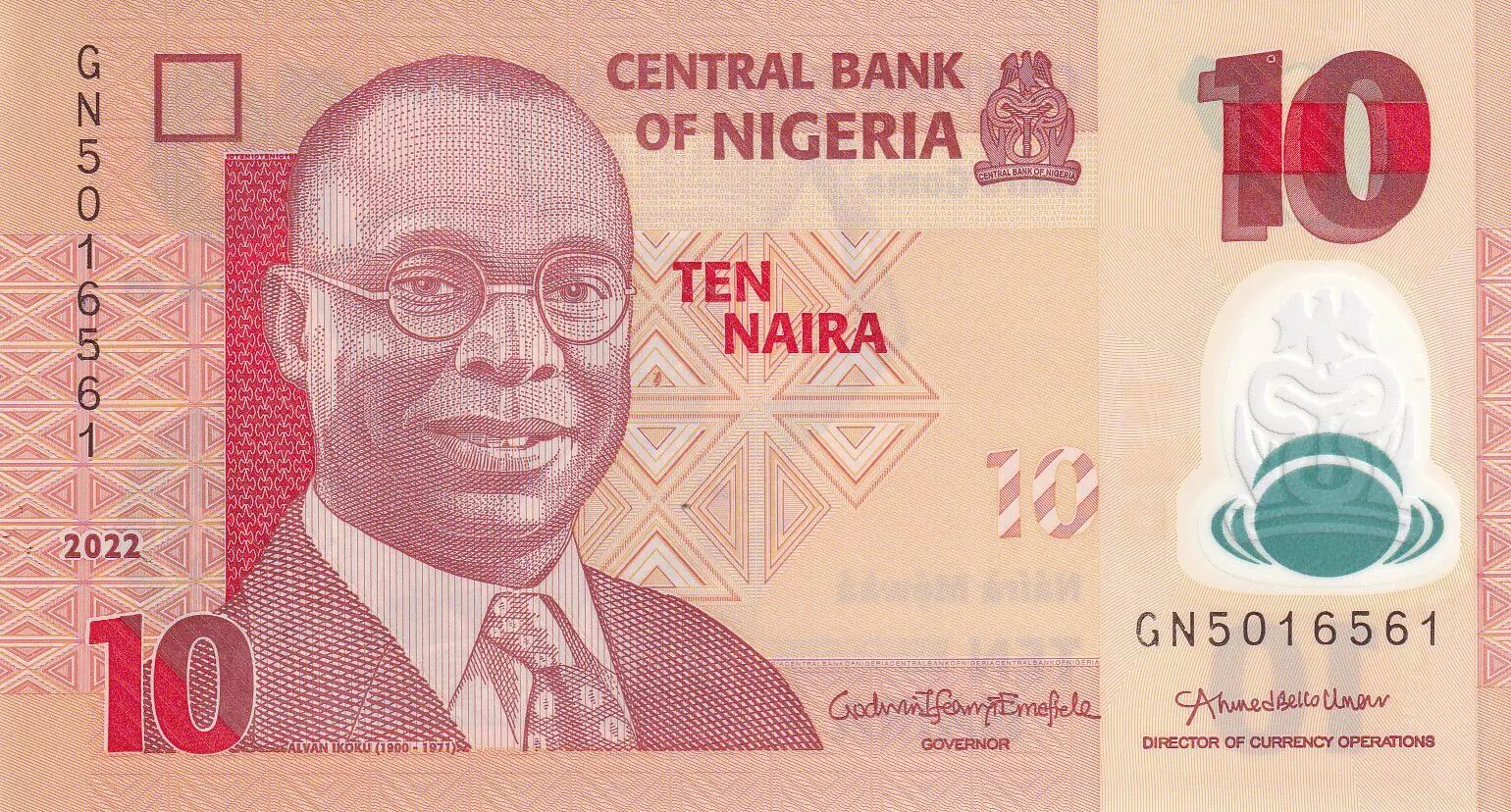 Billet Nigeria 10 Naira - Alvan Nikoku - 2022 - Polymère - Série GN - P.NEW