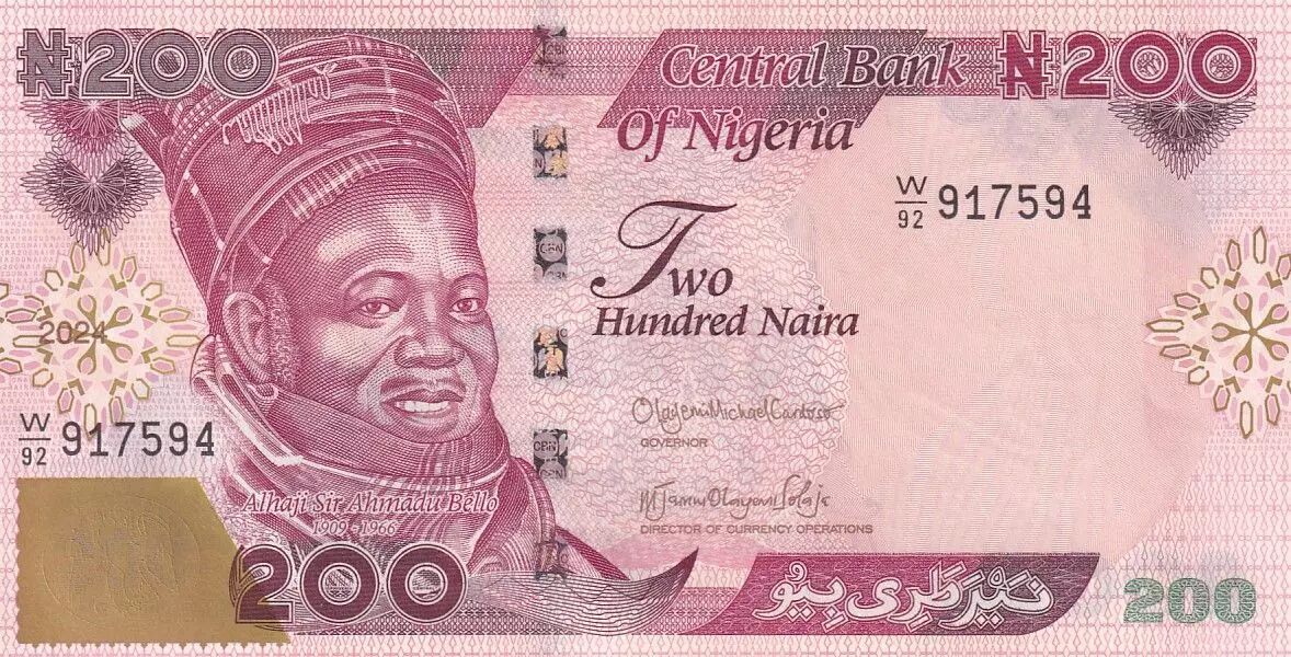 This 200 Naira banknote, issued in 2024, features a dominant dark gray and blue-green color scheme on a multicolored background. The front of the banknote highlights Alhaji Sir Ahmadu Bello, whose portrait appears on the left. The serial numbers, printed in black, as well as the official signatures, are also located on this side. The issue date is positioned on the far left, in the center of the banknote.