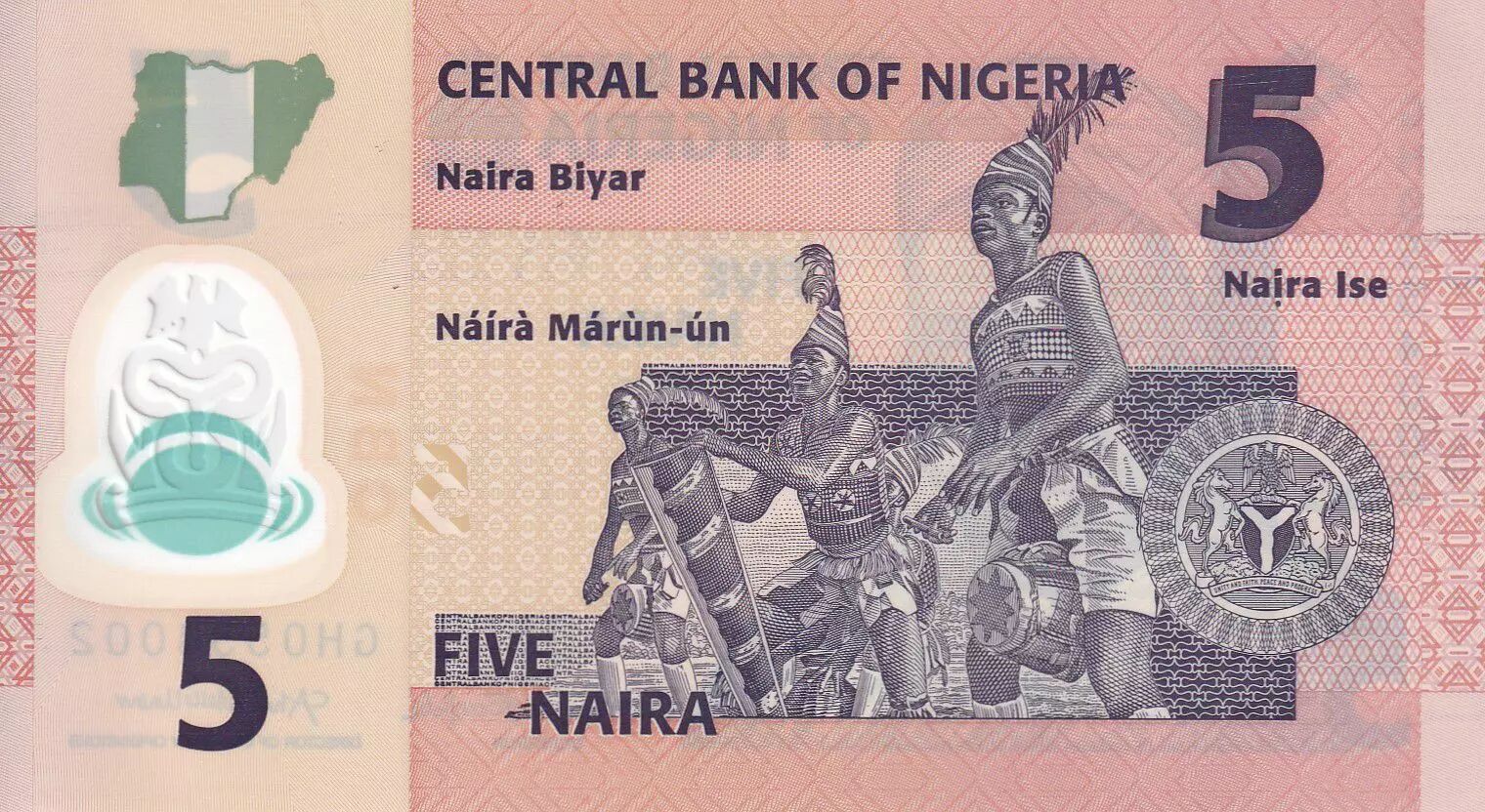 Le verso du billet représente des danseurs de Nkpokiti accompagnés de tambours traditionnels. Les armoiries du Nigeria sont visibles sur le côté gauche. Les inscriptions "CENTRAL BANK OF NIGERIA" sont répétées, ainsi que la valeur nominale "Naira Biyar", "Na?ra Ise", et "Náírà Márùn-ún". La devise "UNITY AND FAITH, PEACE AND PROGRESS" est également inscrite, et la valeur "FIVE NAIRA" est répétée. L'écriture est aussi en alphabet latin.