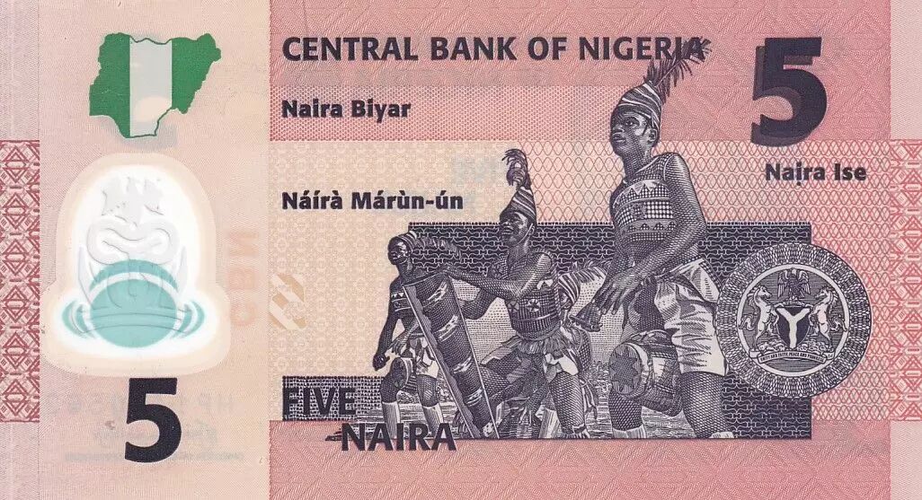 Au verso, on retrouve une représentation de la culture nigériane, plus précisément une scène mettant en valeur des danseurs traditionnels. La valeur nominale "5" est répétée dans les coins supérieurs et inférieurs du billet. Des motifs ornementaux et des éléments de sécurité sont intégrés dans le design pour prévenir la contrefaçon. Les couleurs dominantes du billet sont susceptibles de varier, mais elles sont généralement vives et reflètent l'identité visuelle du pays.