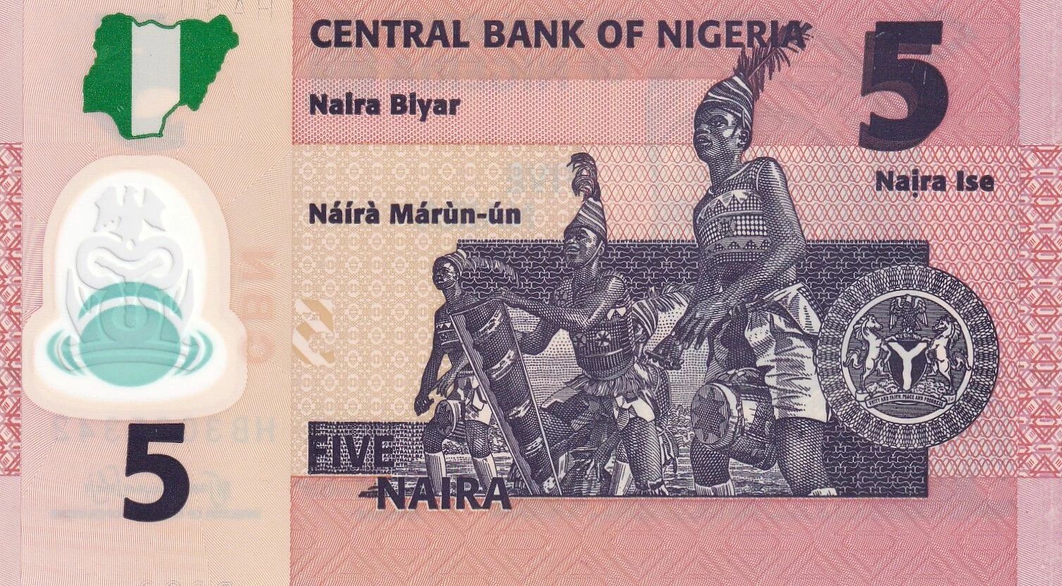 Au verso, on retrouve une représentation de la culture nigériane, plus précisément une scène mettant en valeur des danseurs traditionnels. La valeur nominale "5" est répétée dans les coins supérieurs et inférieurs du billet. Des motifs ornementaux et des éléments de sécurité sont intégrés dans le design pour prévenir la contrefaçon. Les couleurs dominantes du billet sont susceptibles de varier, mais elles sont généralement vives et reflètent l'identité visuelle du pays.