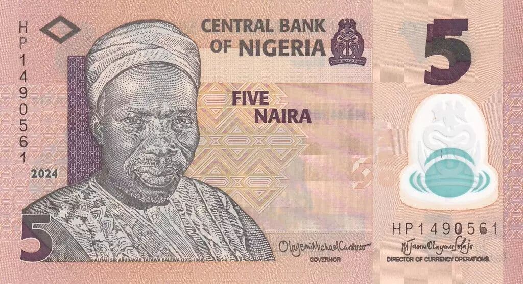 This banknote is issued by Nigeria and has a face value of 5 naira. It dates from the year 2024 and belongs to the HP series. The material used for its manufacture is polymer.