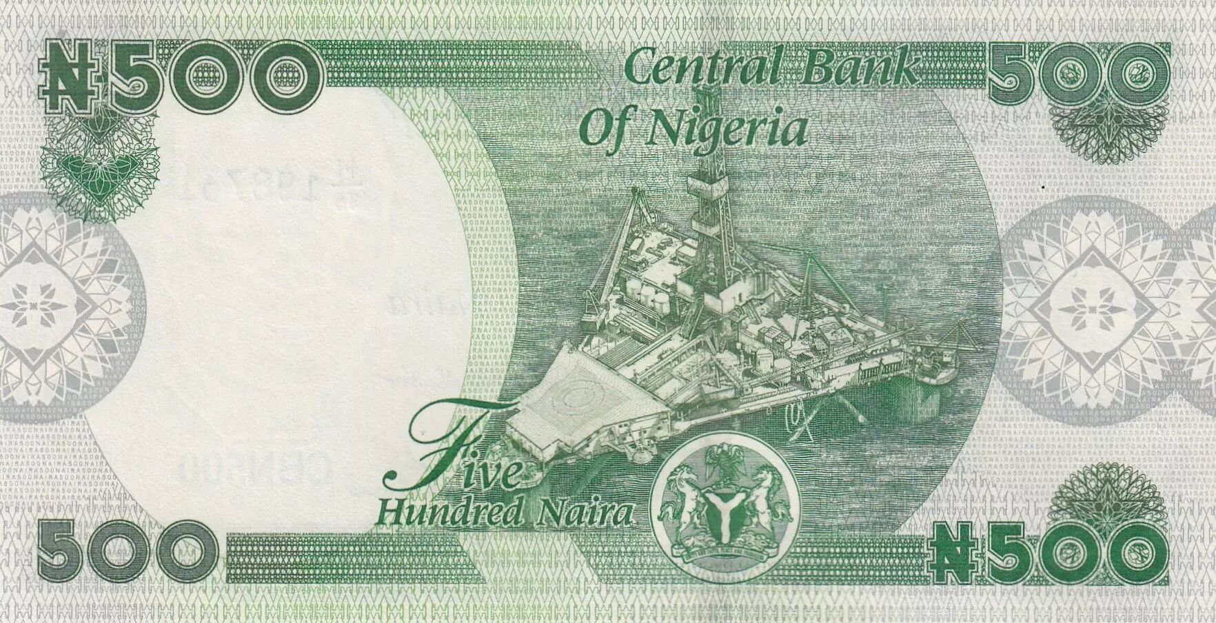 The back of the banknote depicts an offshore oil drilling platform, a symbol of the Nigerian oil industry. The coat of arms of Nigeria is also present.