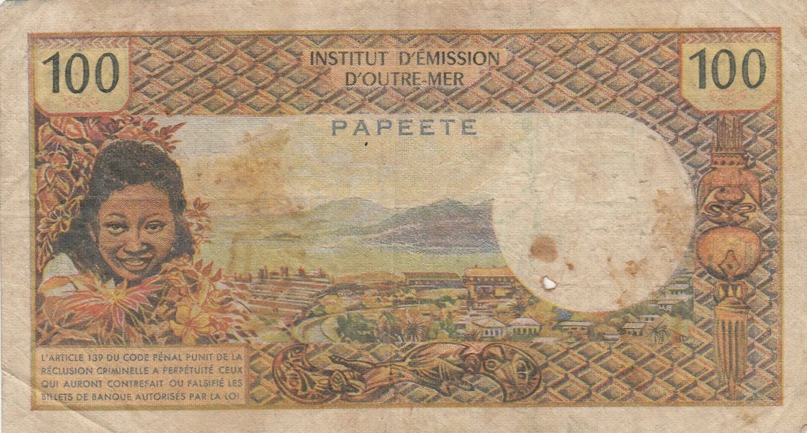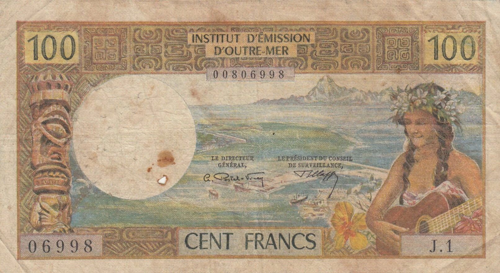 Le billet de 100 francs, émis en Nouvelle-Calédonie en 1969, est un exemple de la série dite "Tahitienne". Ce billet fait partie d'une émission fiduciaire conçue pour les territoires français du Pacifique.