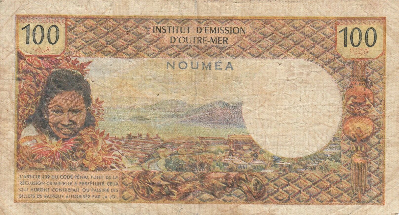 Ce billet de banque de Nouvelle-Calédonie possède une valeur nominale de 100 francs. Il a été émis durant la période allant de 1971 à 1977.
