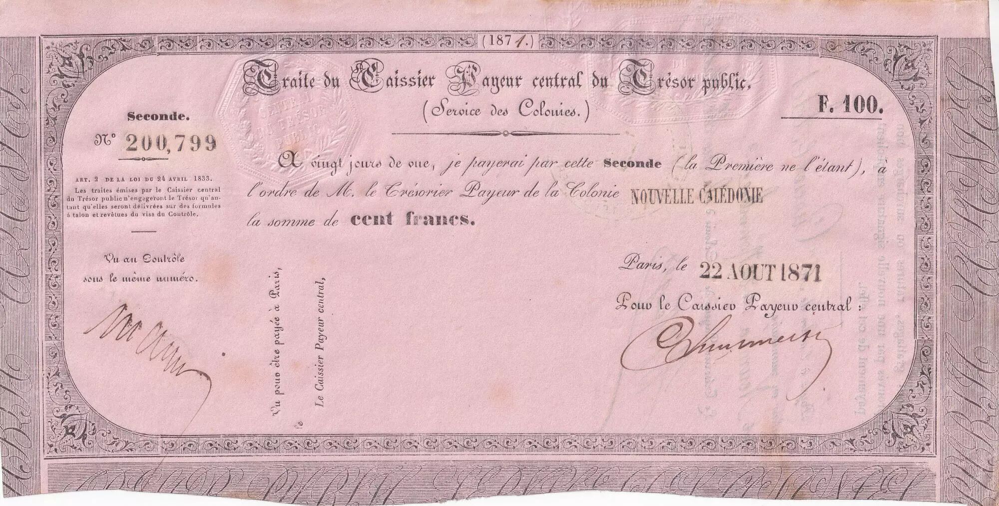 Billet Nle Calédonie 100 Francs - Traite du Trésor Public - 22-08-1871 - SUP+