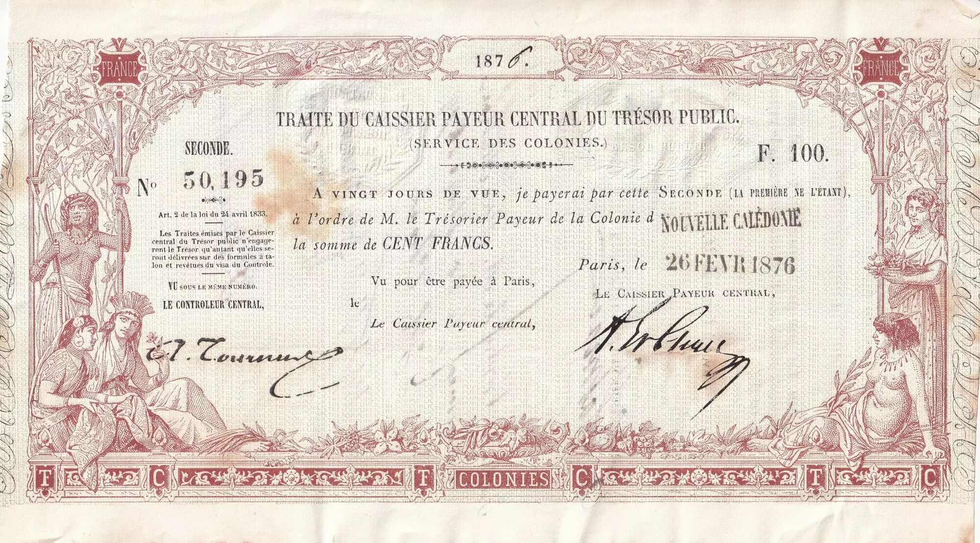 Billet Nle Calédonie 100 Francs - Traite du Trésor Public - 26-02-1876 - TTB+