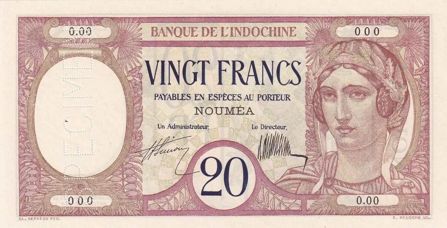 Ce billet de banque est un spécimen de 20 francs émis par la Banque de l'Indochine en 1929 pour la Nouvelle-Calédonie. Le recto du billet présente un visage de femme en médaillon situé sur la partie droite. Les couleurs dominantes sont le lilas-brun sur un fond jaune pâle. Les inscriptions en latin comprennent "BANQUE DE L'INDOCHINE" et "VINGT FRANCS", ainsi que le lieu d'émission, "NOUMÉA". La valeur nominale "20" est également indiquée. Les noms des artistes impliqués dans la conception du billet, "CL. SERVEAU FEC." et "E. DELOCHE SC.", figurent également sur cette face.