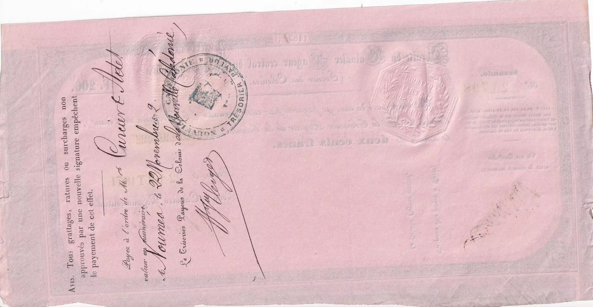 Accueil > Archivage > Nle Calédonie 200 Francs - Traite du Trésor Public - 22-08-1871 - SUP+
