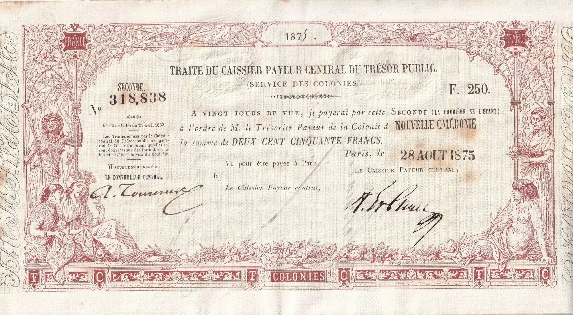Accueil > Archivage > Nle Calédonie 250 Francs - Traite du Trésor Public - 28-08-1875 - SUP