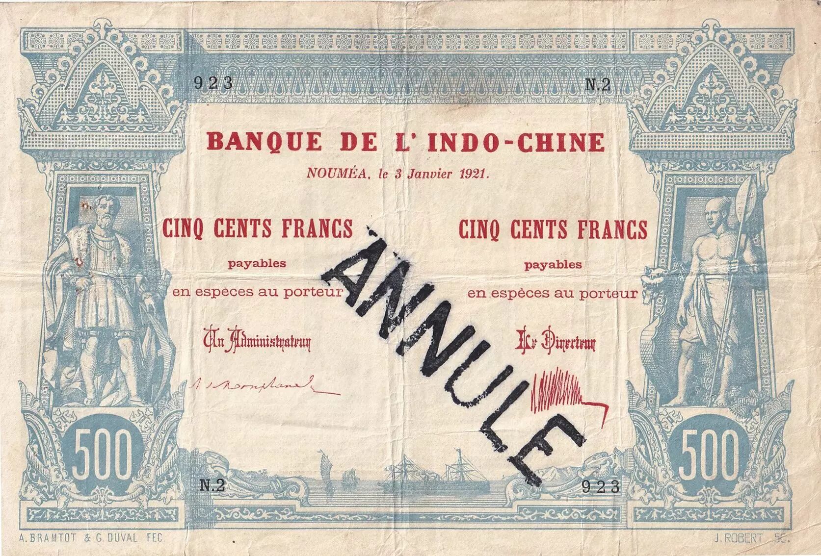 Ce billet de 500 francs a été émis par la Banque de l'Indochine à Nouméa, en Nouvelle-Calédonie, le 3 janvier 1921. Il est identifiable par la mention "sans décret" dans sa désignation, et il s'agit d'un exemplaire annulé.