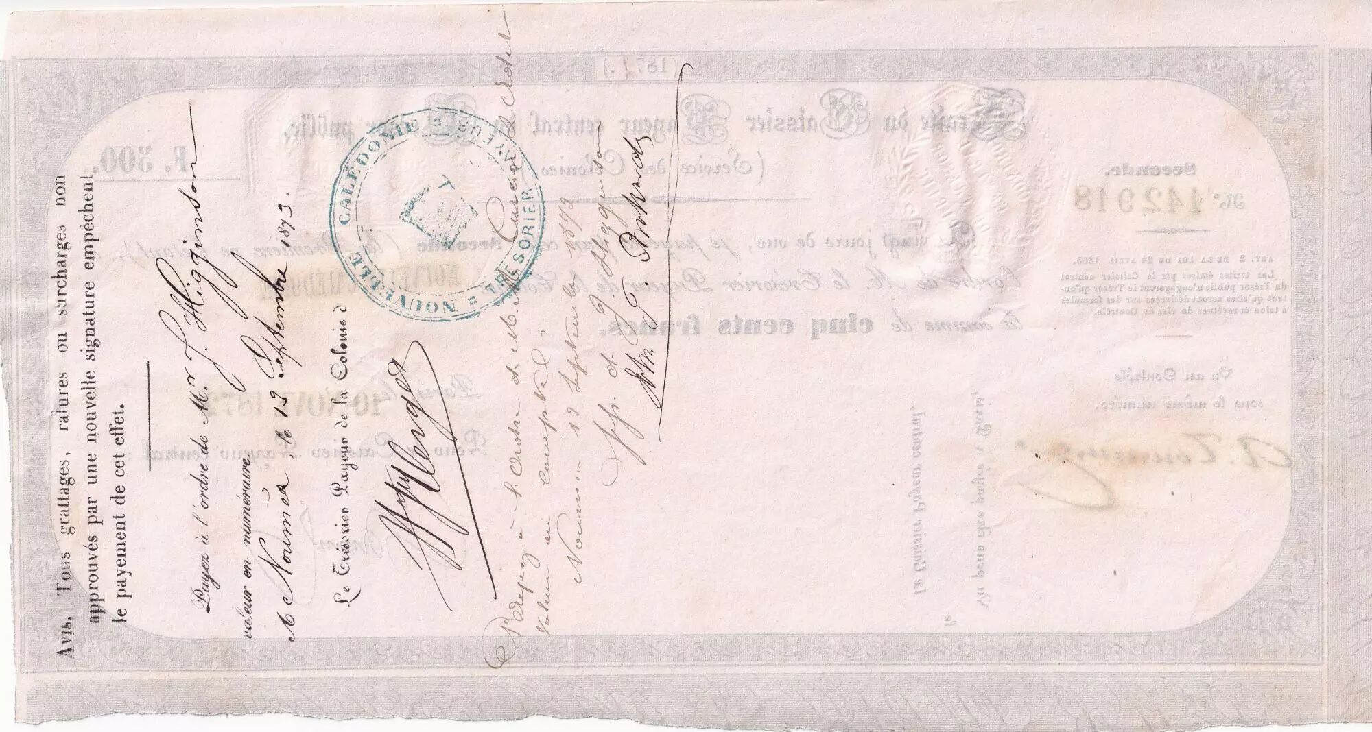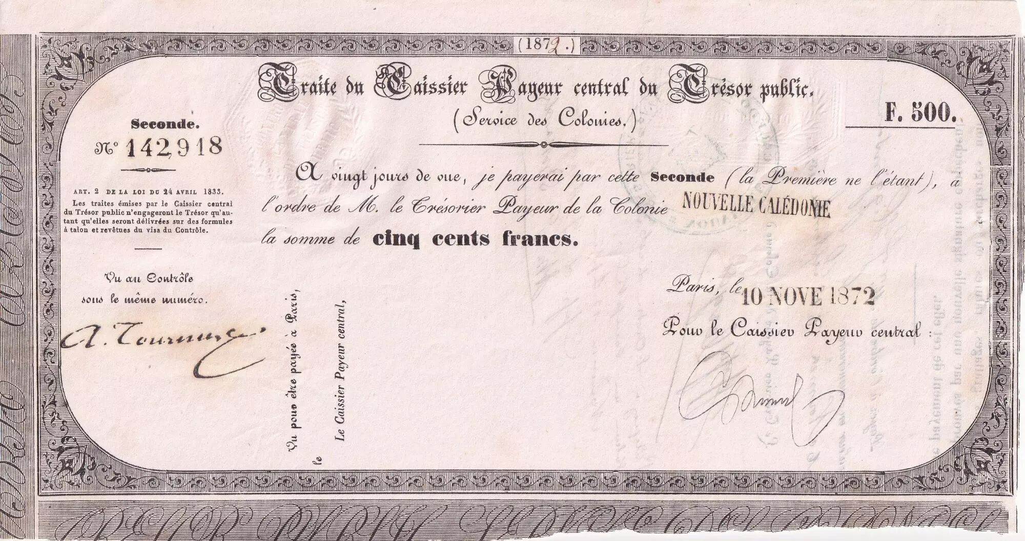 Billet Nle Calédonie 500 Francs - Traite du Trésor Public - 10-11-1872 - SUP+ - N°85