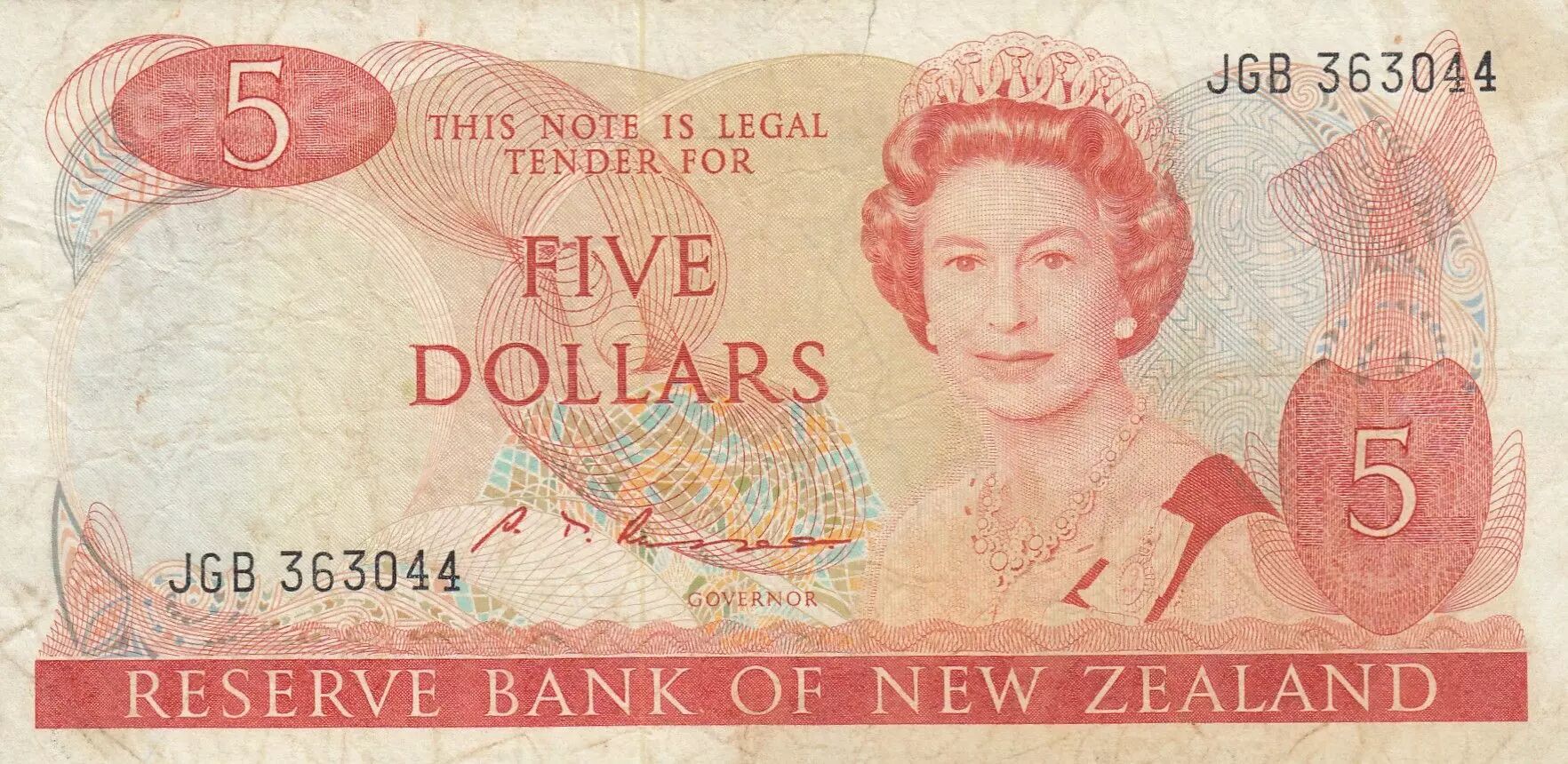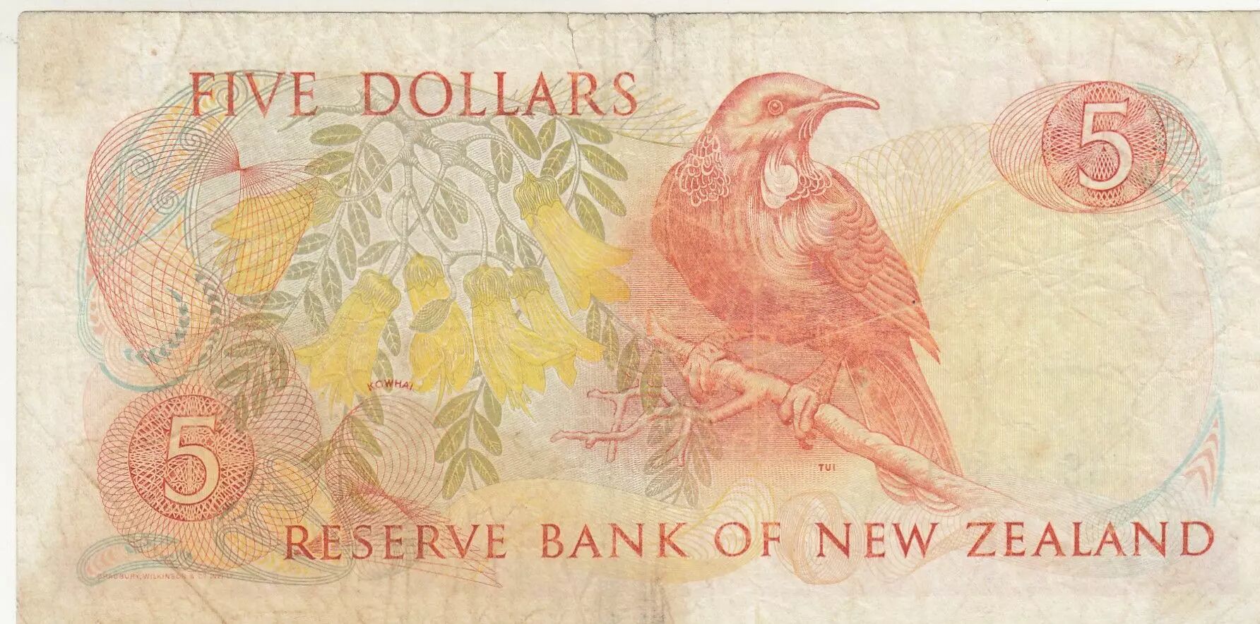 Ce billet de banque de 5 dollars néo-zélandais, émis en 1989, présente des caractéristiques visuelles distinctes sur ses deux faces.