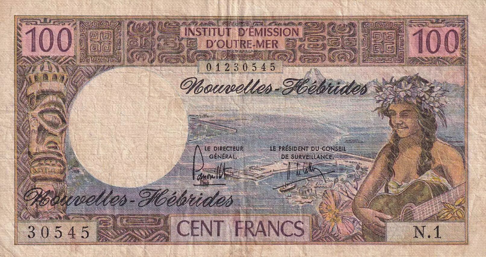 Accueil > Archivage > Nouvelles Hébrides 100 Francs - Tahitienne - 1975 - Série N.1 - TB - P.18c