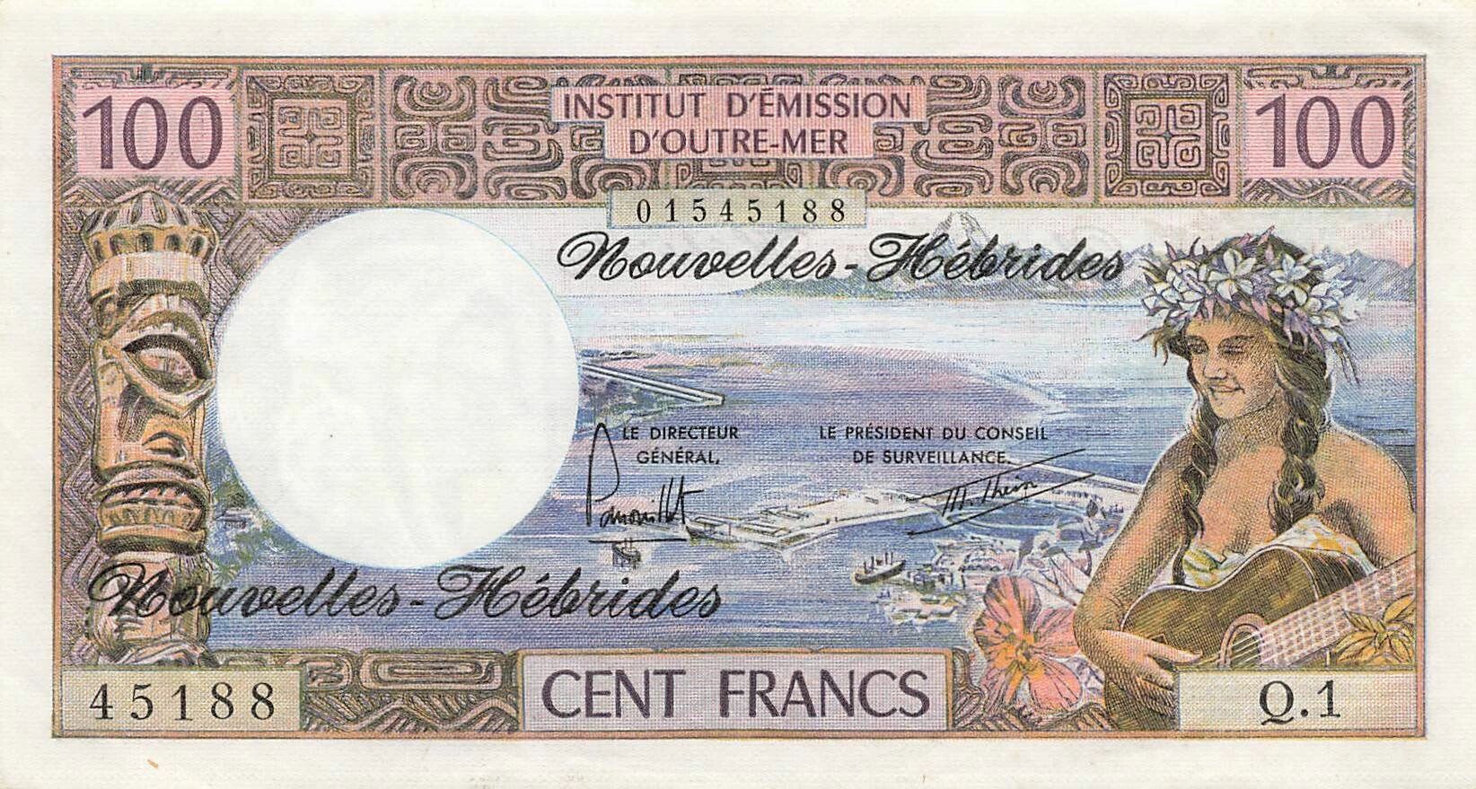 Accueil > Billets du Monde > Billets d'Océanie > Nouvelles Hébrides > Nouvelles Hébrides 100 Francs - Tahitienne - ND (1977) - P.18d