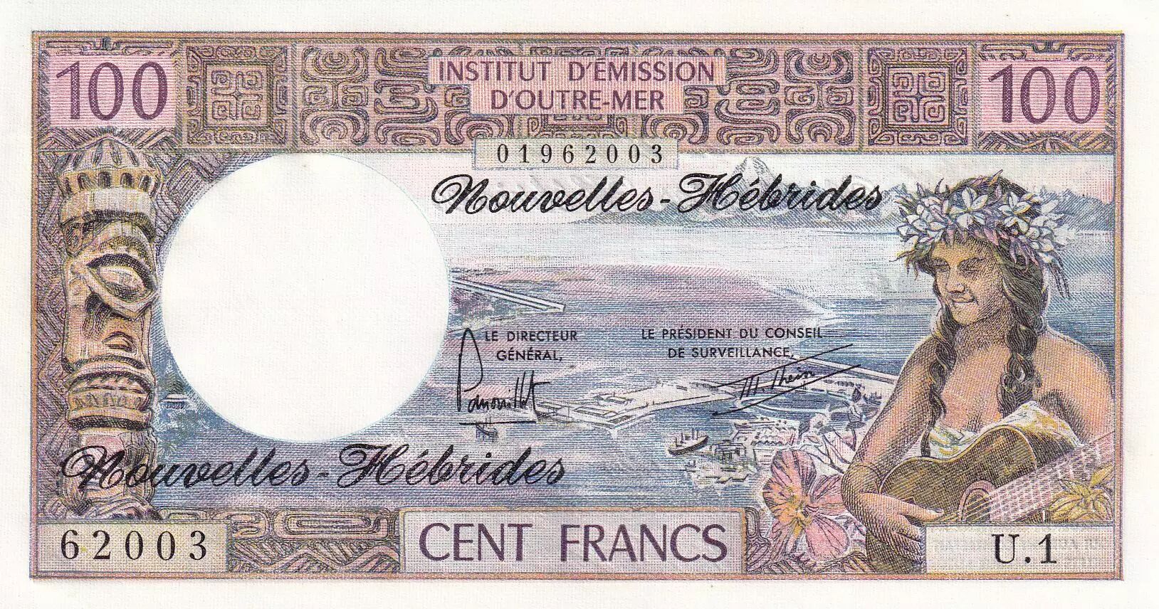 Accueil > Archivage > Nouvelles Hébrides 100 Francs - Tahitienne - ND (1977) - Série U.1 - P.18d