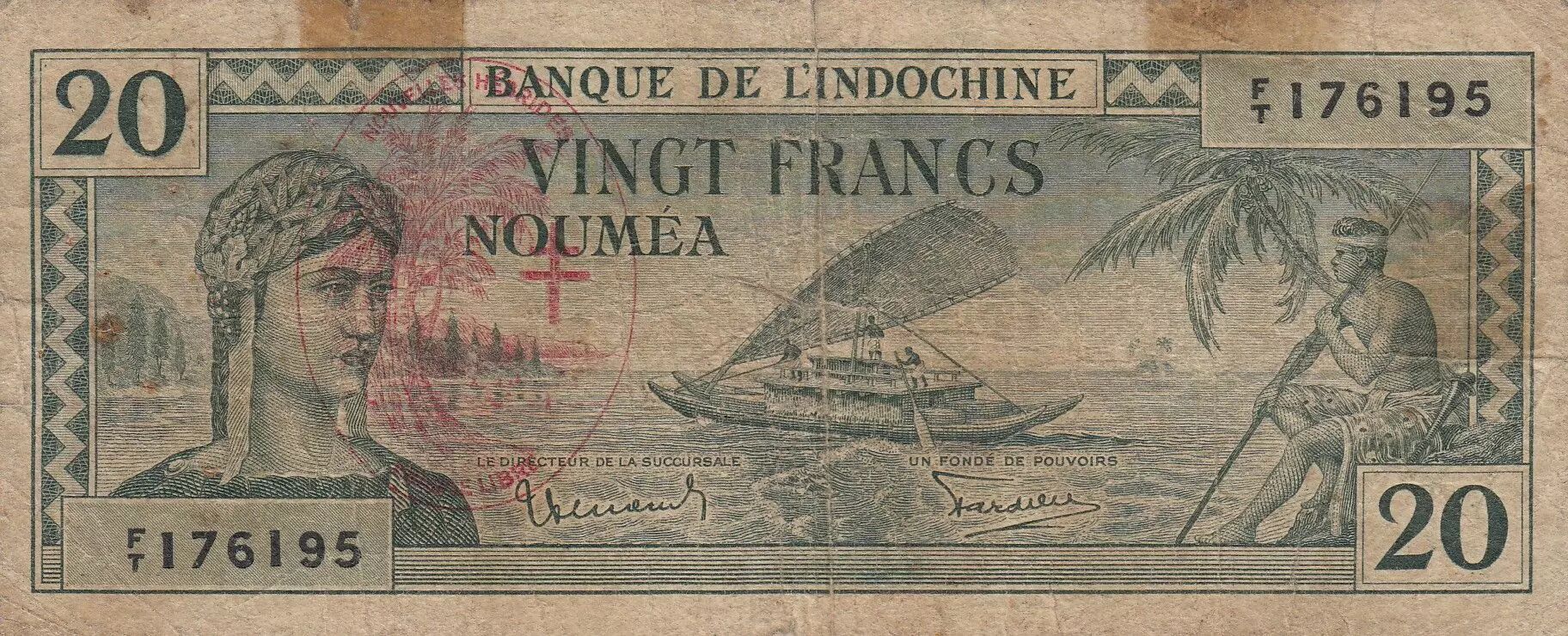 Le billet de 20 francs des Nouvelles-Hébrides, datant de 1945, présente un recto de couleur verte. On y observe une femme portant une couronne sur la gauche, un bateau au centre, et un pêcheur autochtone à droite. Une surimpression ovale rouge se distingue, portant l'inscription "NOUVELLES HÉBRIDES FRANCE LIBRE" accompagnée de palmes et d'une croix de Lorraine. Cette surimpression est apposée sur un billet de Nouvelle-Calédonie référencé P-49.