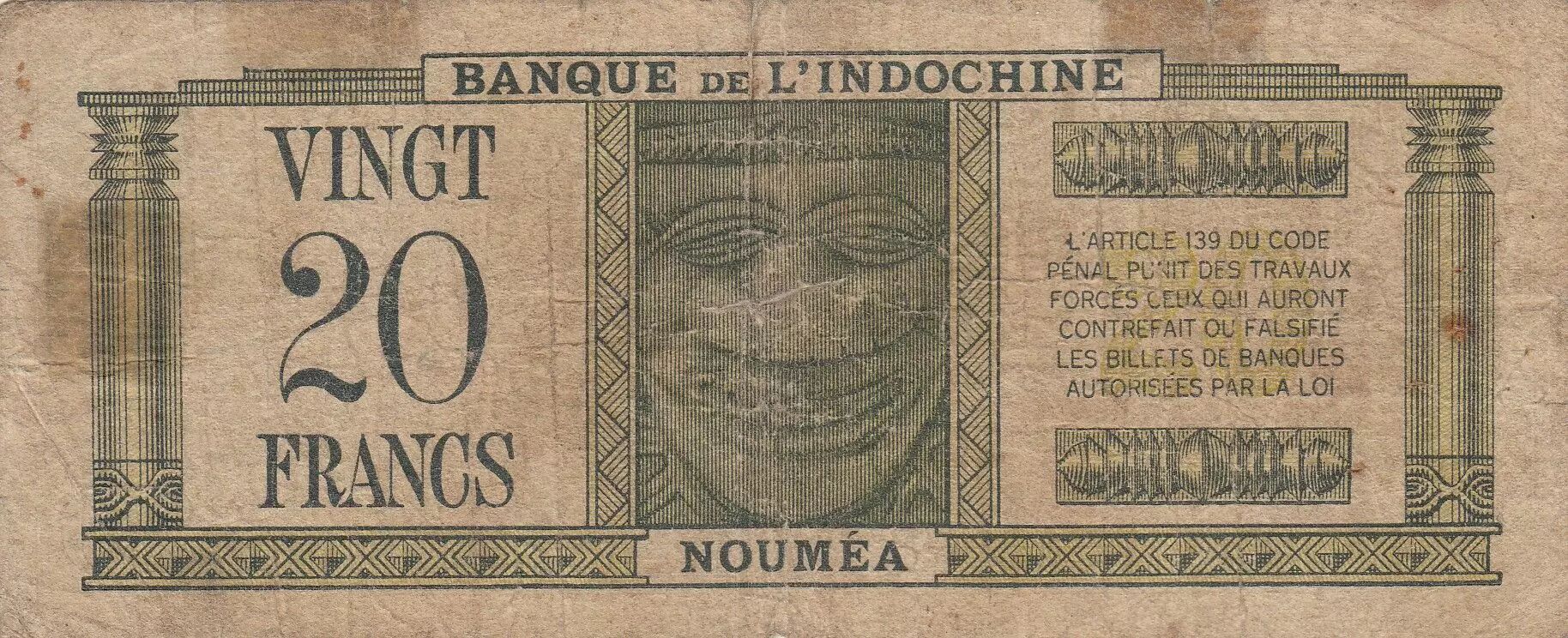 Les inscriptions "BANQUE DE L'INDOCHINE", "VINGT FRANCS", et "NOUMÉA" sont également présentes, ainsi que la valeur nominale "20".