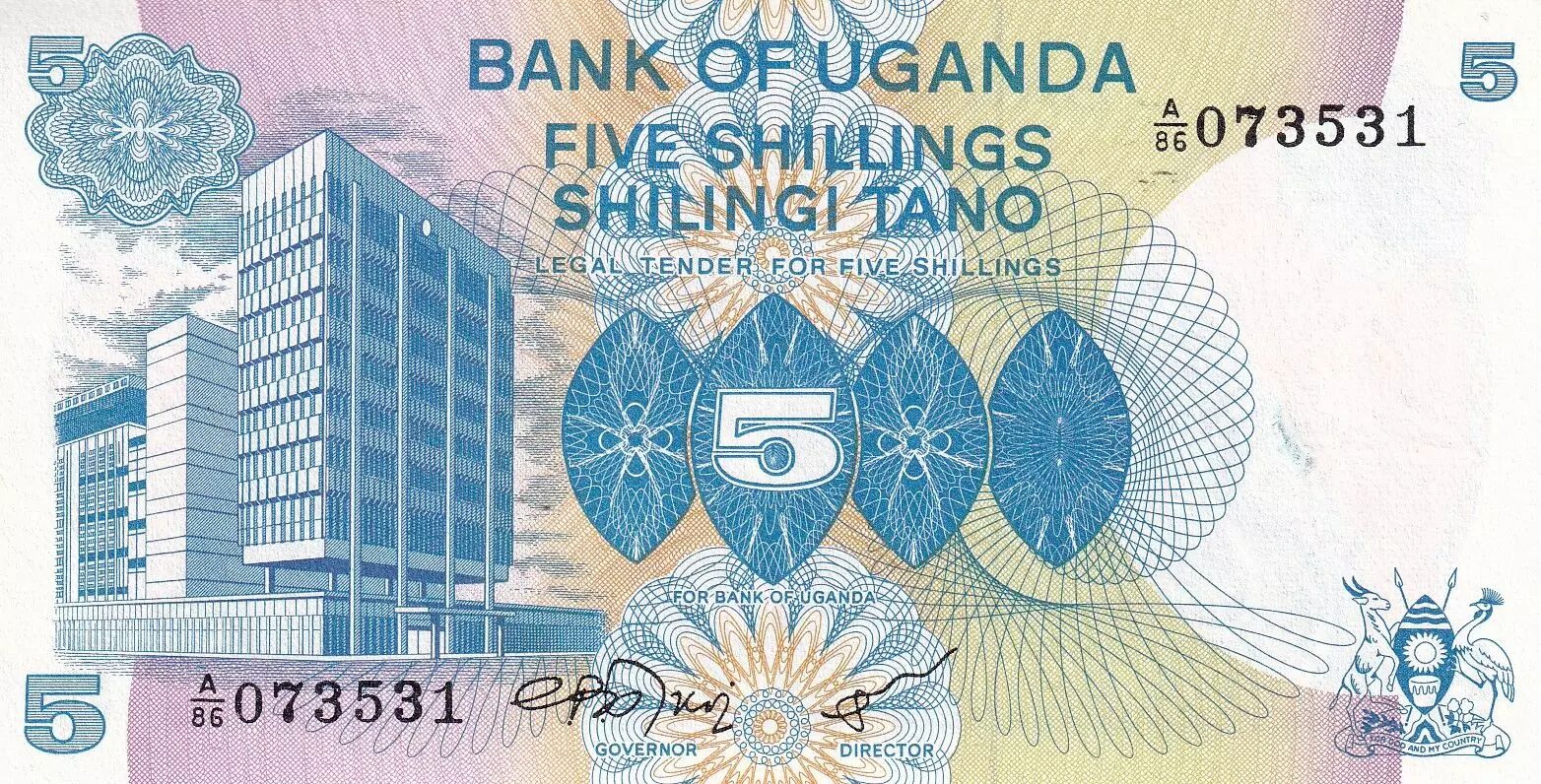 Billet Ouganda 5 Shillings - Bâtiment - Jeune Femme - 1979 - Série A.86 - P.10