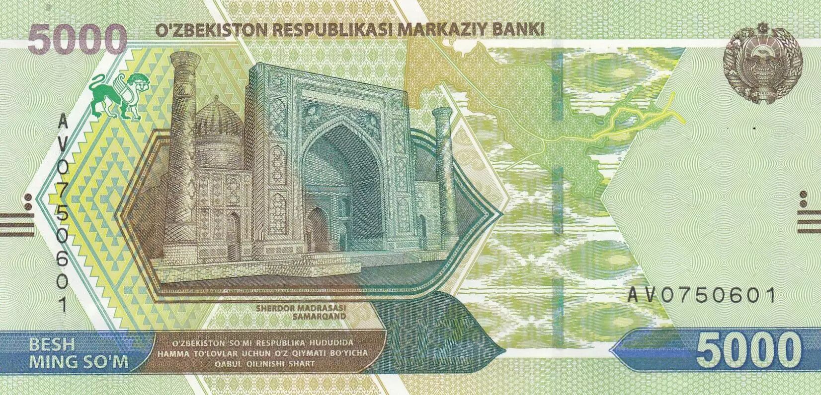 Accueil > Billets du Monde > Billets d'Asie > Ouzbékistan > Ouzbékistan 5000 Som - Monuments archéologiques d'Afrosiyob - 2021 - Série AV