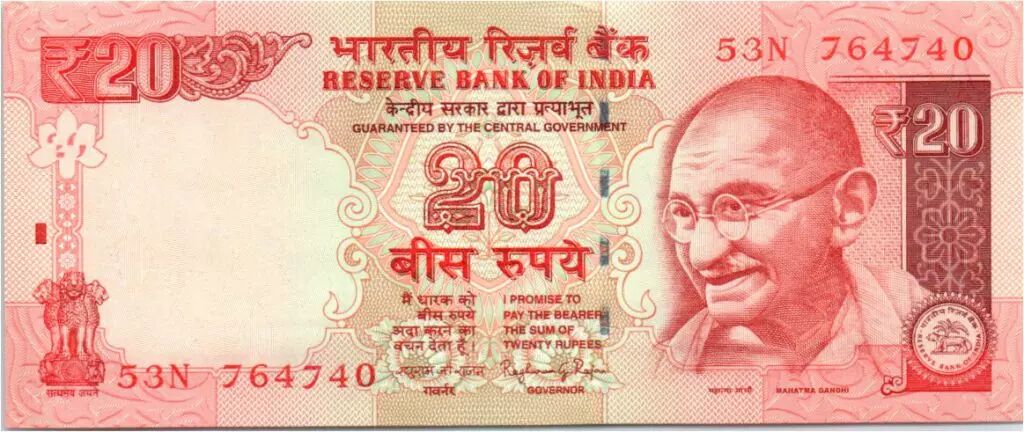 Billet Inde 20 Rupees, Mahatma Gandhi - Plage - 2015
