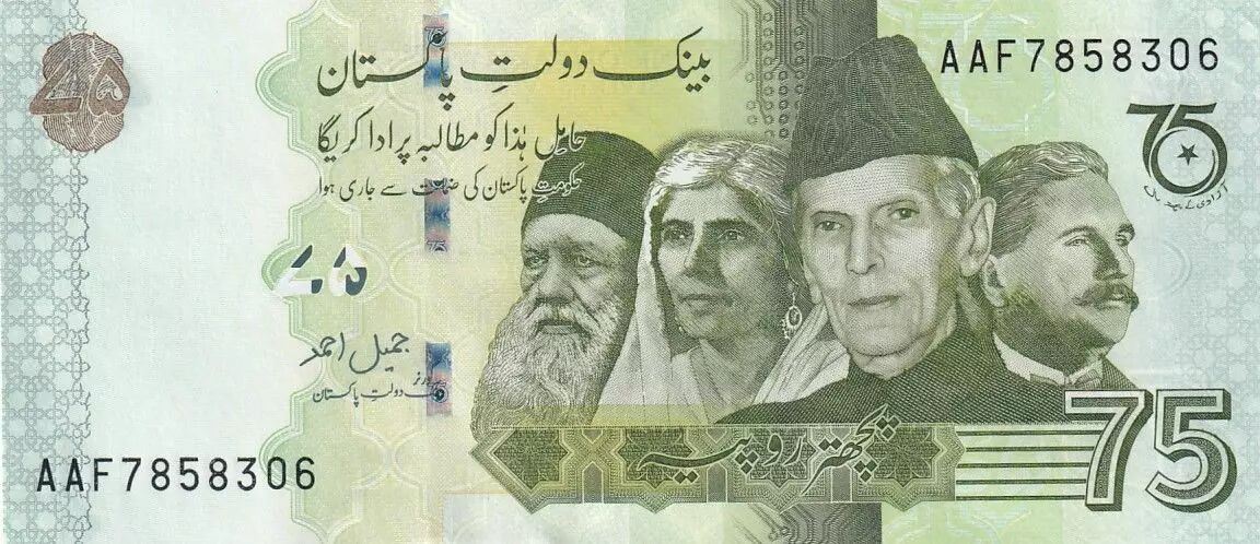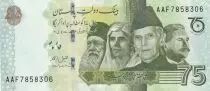 Home > World Banknotes > Asian Banknotes > Pakistan > Pakistan 75 Rupees - M. Ali Jinnah - Mohtarma Fatima Jinnah - 2022 - Serial AAF