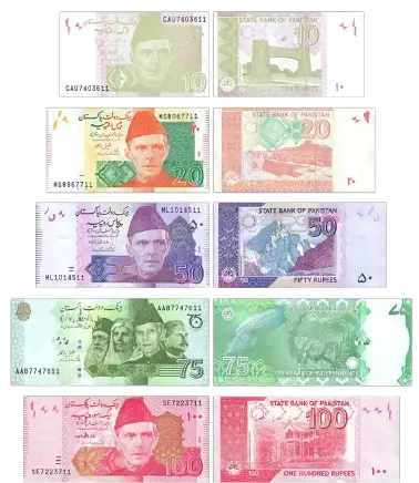 Cet ensemble comprend cinq billets de banque du Pakistan, chacun représentant une valeur nominale distincte : 10, 20, 50, 75 et 100 roupies. Les billets ont été émis entre 2018 et 2022.