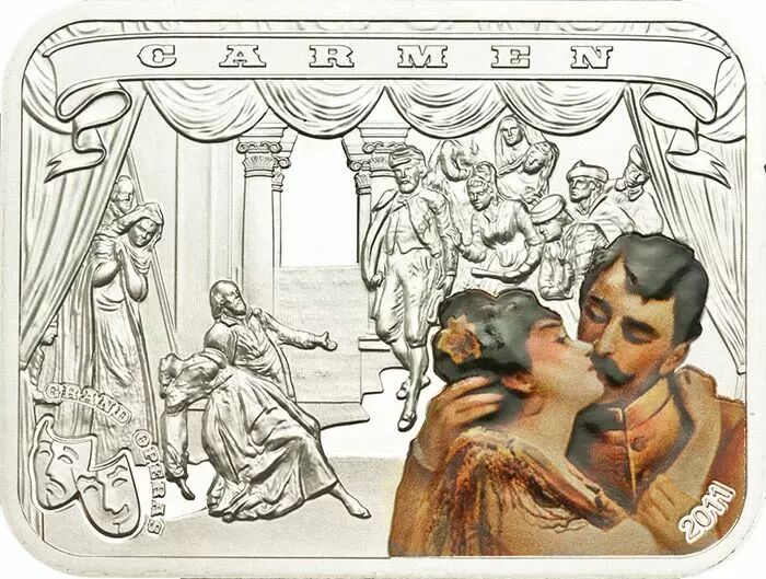 Sur cette pièce en argent pur consacrée à Carmen on retrouve au premier plan Carmen et Don José les héros de l'opéra de Bizet dont l'histoire a été écrit par Prosper Mérimée.