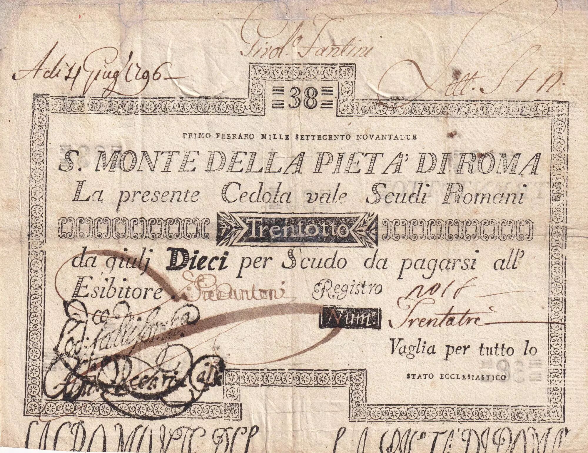 Banknote Papal States 38 Scudi - Monte della Pieta Di Roma - 1797