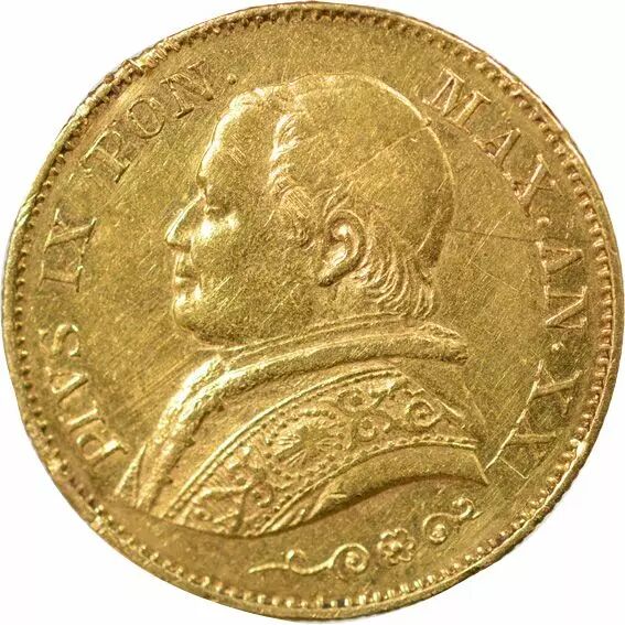 Coin Papal States Pius IX - 20 Gold Lire - 1866 R Rome, Year XXI
