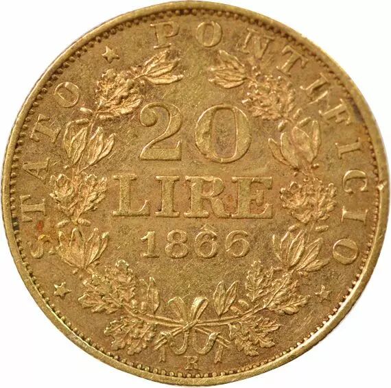 Home > > Papal States Pius IX - 20 Gold Lire - 1866 R Rome, Year XXI