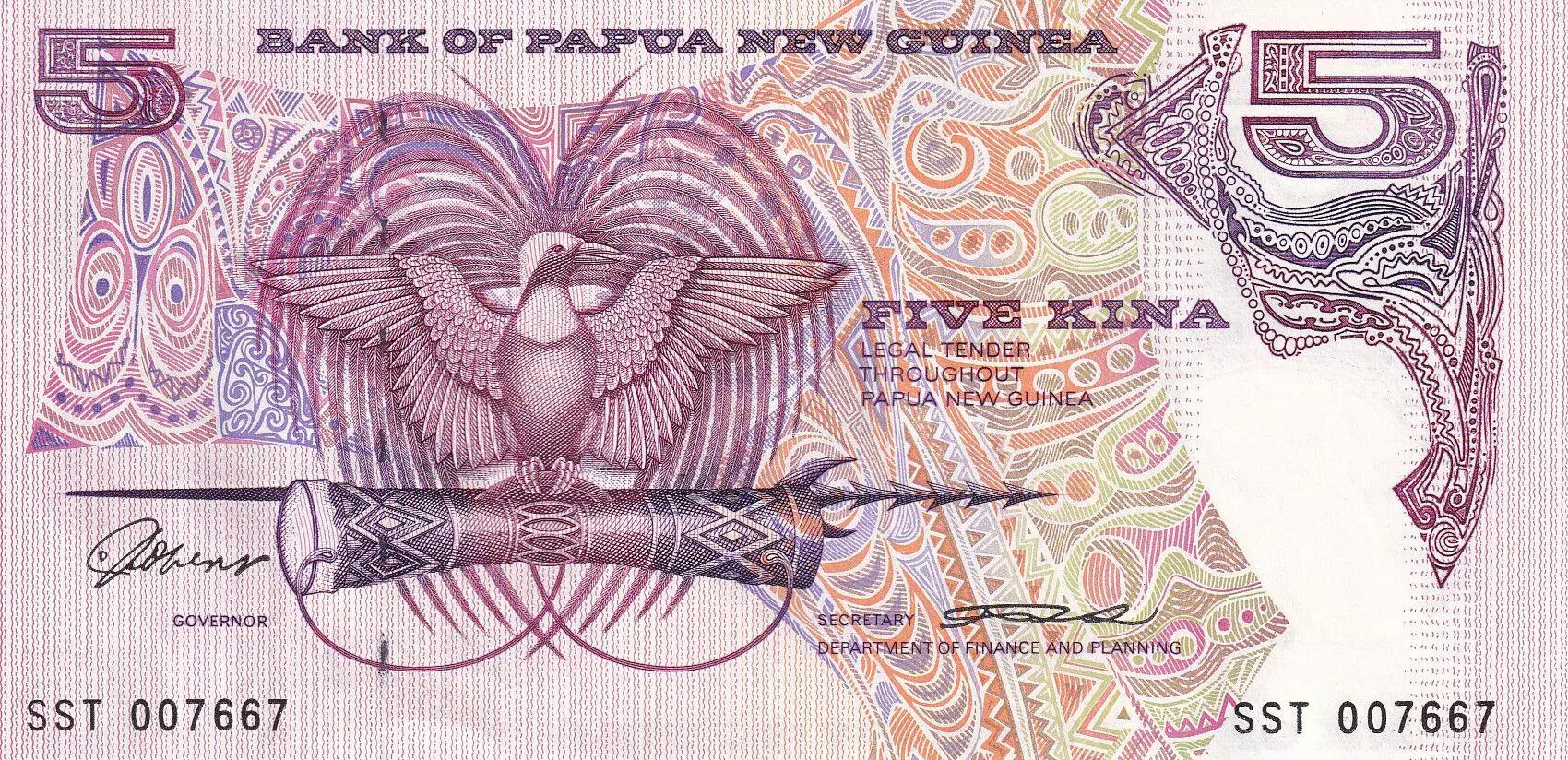 Billet Papouasie-Nouvelle-Guinée 5 Kina - Oiseau de Paradis - Masque - ND (1993) - Série SST