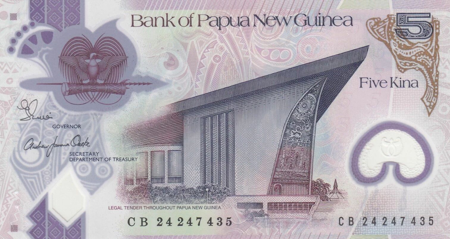 Ce billet de banque est émis par la Papouasie-Nouvelle-Guinée et présente une valeur nominale de 5 kina. L'émission de ce billet date de 2024 et il appartient à la série CA.