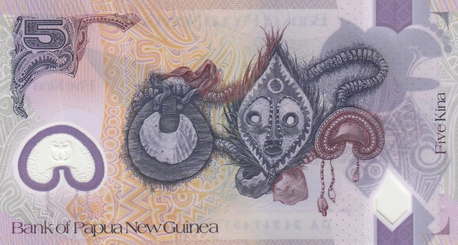 Le verso du billet présente un masque traditionnel. Ce masque est un élément culturel significatif, représentant les traditions artistiques et culturelles de la Papouasie-Nouvelle-Guinée. Le masque est reproduit avec une attention particulière aux détails, mettant en valeur les motifs et les couleurs typiques de l'art traditionnel local.