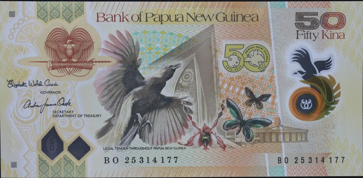 La valeur nominale de ce billet est de 50 Kina, la monnaie officielle de la Papouasie-Nouvelle-Guinée. Les billets en polymère sont reconnus pour leur durabilité accrue et leur résistance à la contrefaçon, offrant ainsi une plus longue durée de vie en circulation comparés aux billets traditionnels en papier.