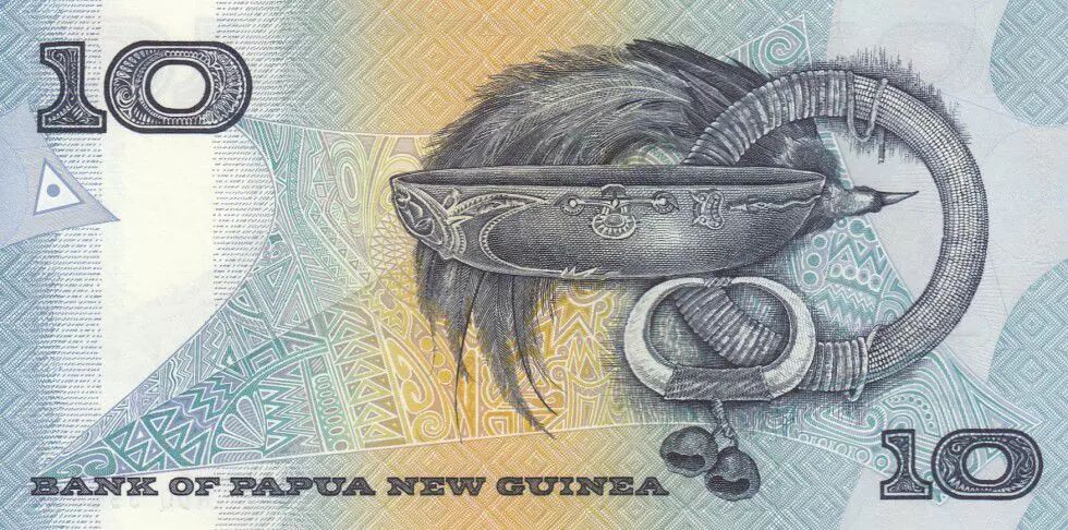 Home > World Banknotes > Oceania Banknotes > Papua New Guinea > Papua New Guinea 10 Kina Bird of Paradise - Artifacts - Serial NDQ - 1988