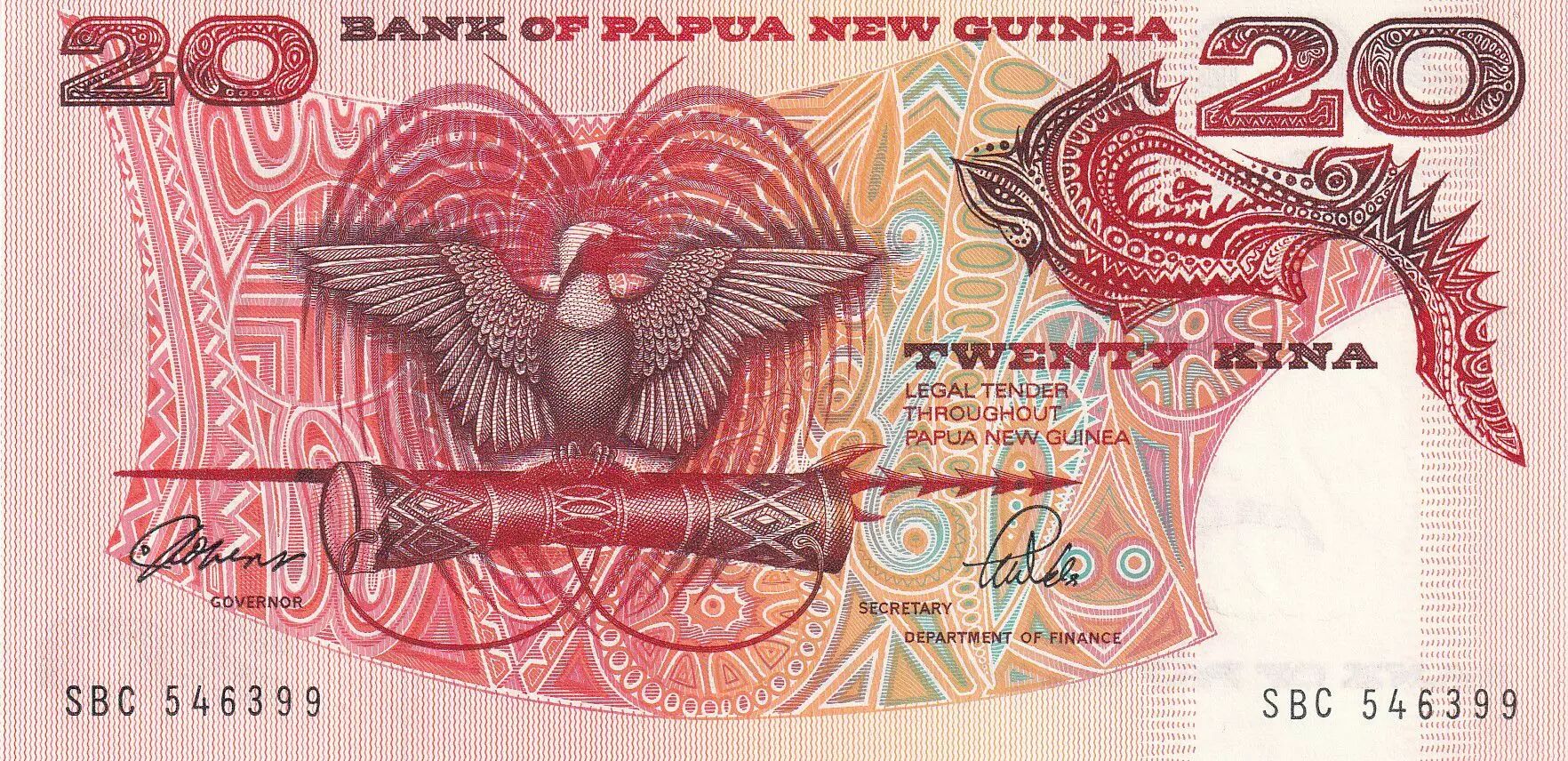 Home > World Banknotes > Oceania Banknotes > Papua New Guinea > Papua New Guinea 20 Kina - Bird of Paradise - Head of boar - ND (1981) - Serial SBC - P.10a