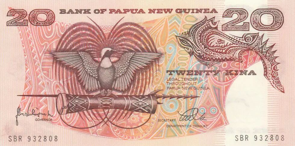 Banknote Papua New Guinea 20 Kina Bird of Paradise - Head of boar - Serial SBR - 1988