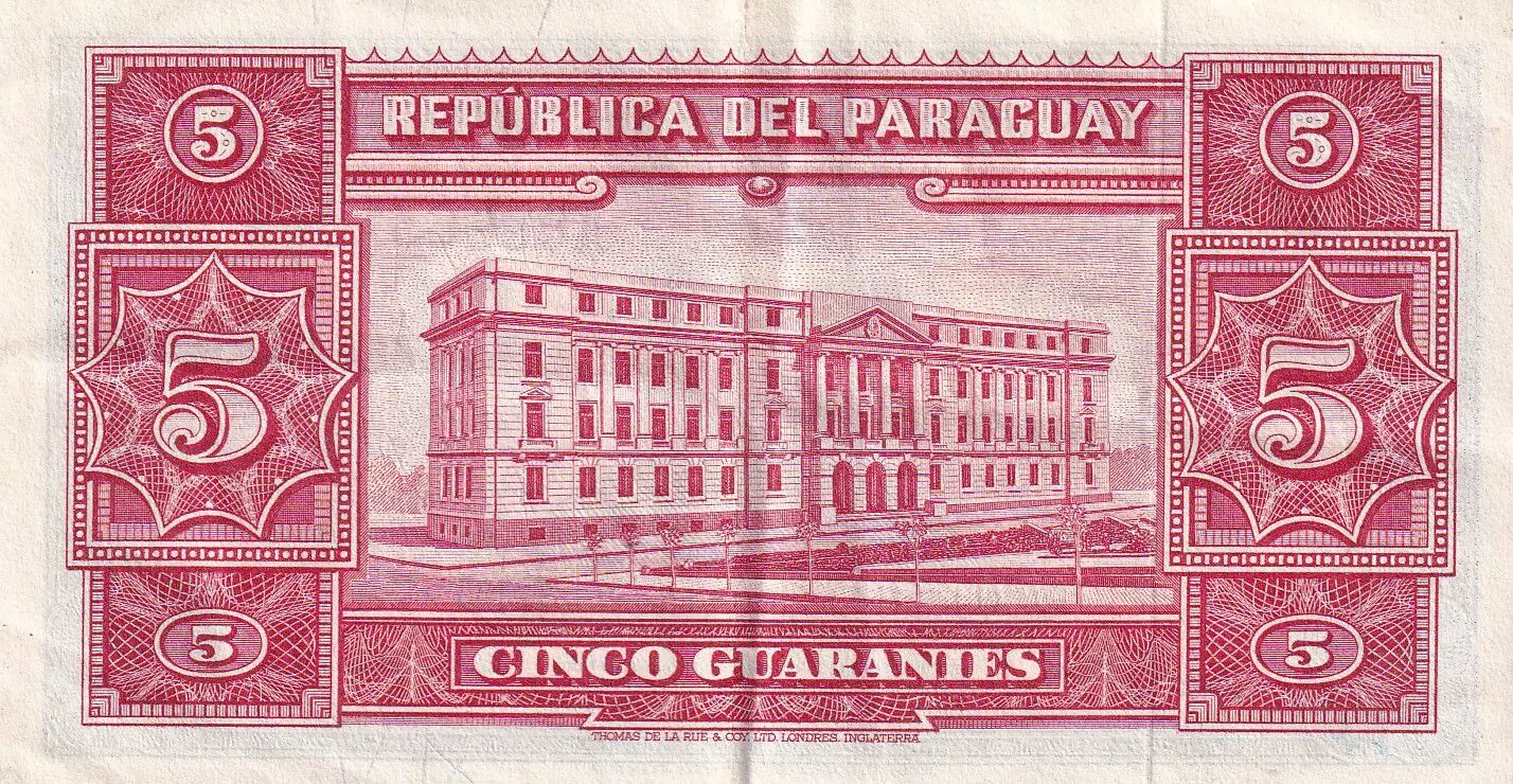 Home > > Paraguay 5 Guaranies - José E. Diaz - 1952 - VF+ - P.186c