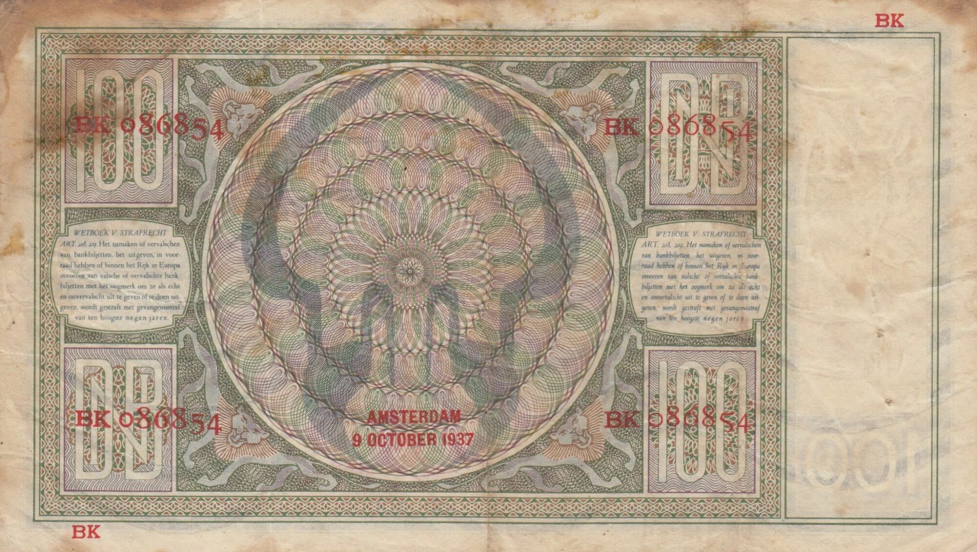 Ce billet de banque des Pays-Bas présente une valeur nominale de 100 gulden, émis en 1937.