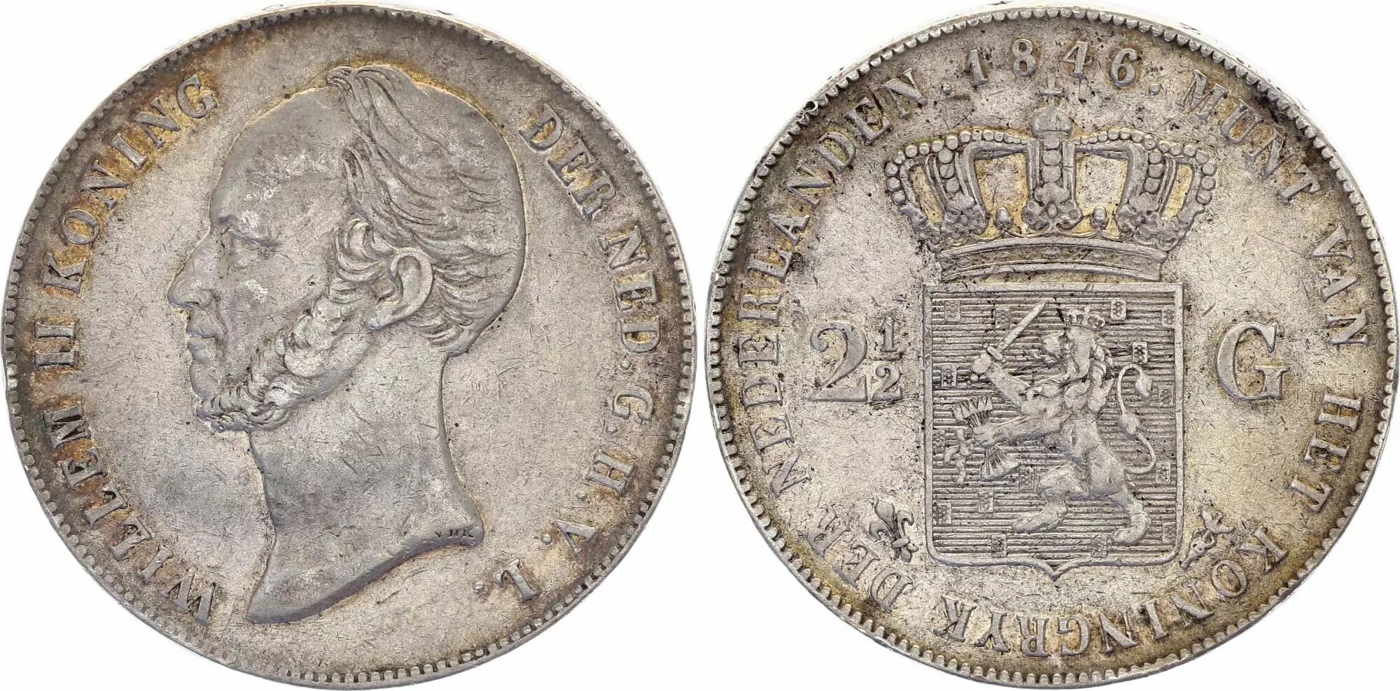 Cette pièce de monnaie est un 2 1/2 gulden frappé aux Pays-Bas en 1846. Elle est identifiable par sa valeur nominale de deux et demi gulden, l'unité monétaire utilisée à l'époque. La pièce est frappée en argent, ce qui confère à sa couleur un aspect argenté brillant, bien que cela puisse varier en fonction de son état de conservation et de son exposition à l'oxydation.