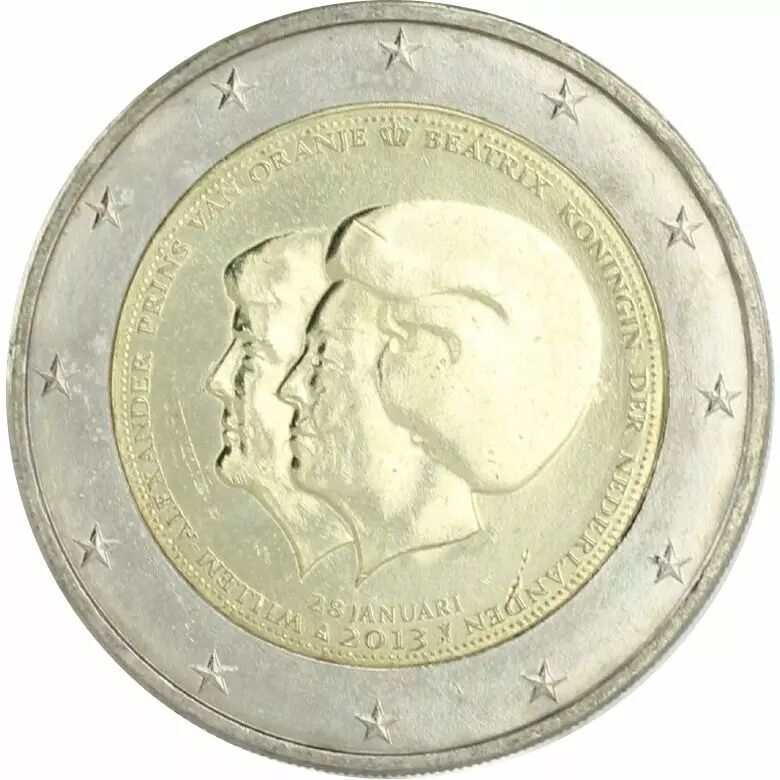 La Monnaie Royale des Pays-bas a décidé de frapper cette pièce de 2 euros commémorative 2013 avec les 2 portraits de la reine et du nouveau roi. La date du 28 janvier 2013 portée sur la pièce est la date de l'annonce faite lors du discours radiotélévisé.