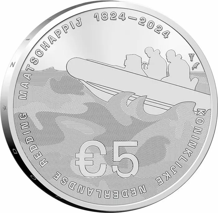 La pièce de 5 euros "200 ans de l'asociation royale du sauvetage en mer" (KNRM) a été conçue par Coralie Vogelaar, en collaboration avec le designer Hendrik-Jan Grievink. L'avers de la pièce représente le roi des Pays-Bas Willem-Alexander. On le voit regarder la côte paisible de la mer du Nord, le regard fixé sur l'horizon. Dans la partie supérieure, le texte " Willem-Alexander, Koning der Nederlanden " commence et se poursuit en demi-cercle. Au revers de la pièce, la mer se montre sous un jour bien différent : les vagues turbulentes et sauvages portent la silhouette d'un bateau de sauvetage de la KNRM avec deux volontaires à son bord. Lorsque la pièce bouge, la lumière change, ce qui accentue encore la dynamique de la mer. Le texte "Koninklijke Nederlandse Redding Maatschappij 1824 - 2024" figure également au revers, tout comme la marque privée et la marque d'atelier.