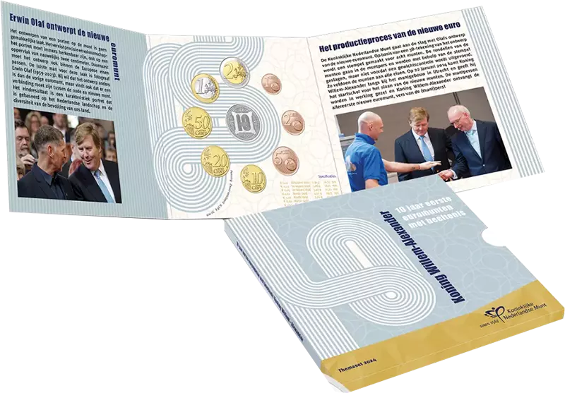Le set thématique 2024 est à nouveau présenté dans un emballage spécial qui évoque les 10 ans de pièces en euros à l'effigie du roi Willem-Alexander. L'emballage contient également des informations supplémentaires sur l'ensemble du processus, de la conception à la mise en circulation des pièces.