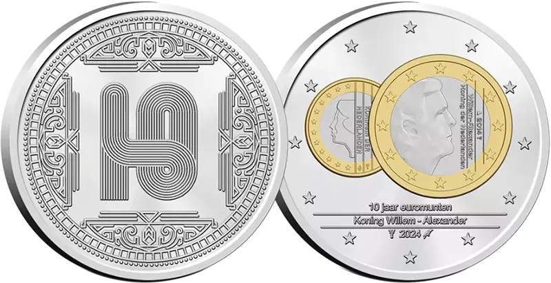Outre toutes les pièces néerlandaises en euros à partir de 2024, le coffret thématique contient également une médaille spéciale, conçue pour cet événement particulier qui s'est produit il y a dix ans. L'avers présente un dessin étonnant, avec au centre le chiffre 10. Le revers de la médaille montre deux pièces d'euro, avec au recto l'image du roi et au verso l'image de l'ancienne reine Beatrix. Cela indique la transition des images sur les pièces d'euro néerlandaises.