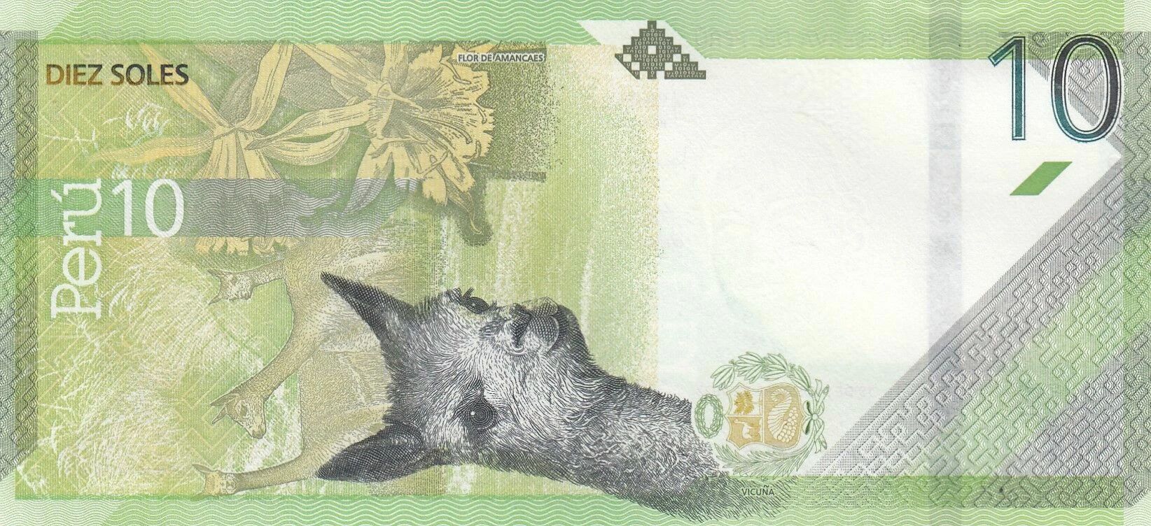 Le verso du billet présente une représentation de la faune péruvienne, en l'occurrence le lama, un animal emblématique des Andes. Le paysage andin sert de toile de fond, soulignant la richesse naturelle du Pérou. Des éléments de sécurité avancés sont incorporés dans le design pour prévenir la contrefaçon, tels que des filigranes, des micro-impressions et des encres spéciales. La dénomination faciale est visible ainsi que la mention du pays émetteur.