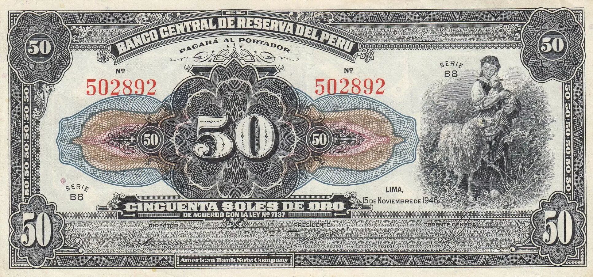 Billet Pérou 50 soles Oro - Agneau et mouton - 15-11-1946 - Série B8